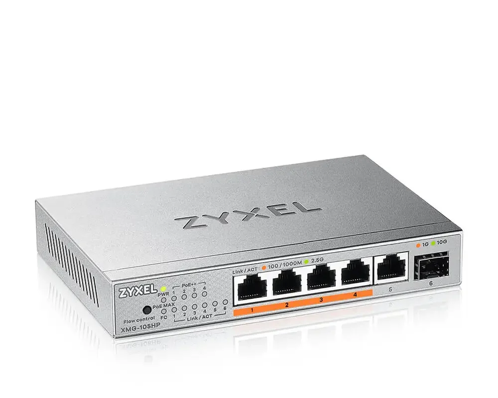 Unmanaged Multi-Gigabit PoE Switch Zyxel XMG-105HP, 5xRJ-45: 1/2.5G (4x PoE++), 1xSFP+, 70W PoE budget, desktop, fanless